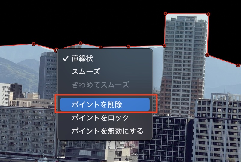 インスペクタで用意されているオプションは基本的にシェイプマスクとほぼ同じですが、ビューアでできることはさらに多く、作成したポイントを動かしてマスクの形を変形したり、ポイントを右クリックすることで削除できます。