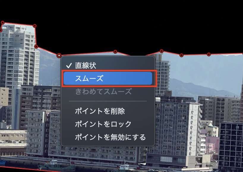 デフォルトでは作成したマスクは直線状となっているのですが、ポイントを右クリックして「スムーズ」を選択すると、ベジェ曲線ハンドルが現れ、パスを滑らかにすることができます。