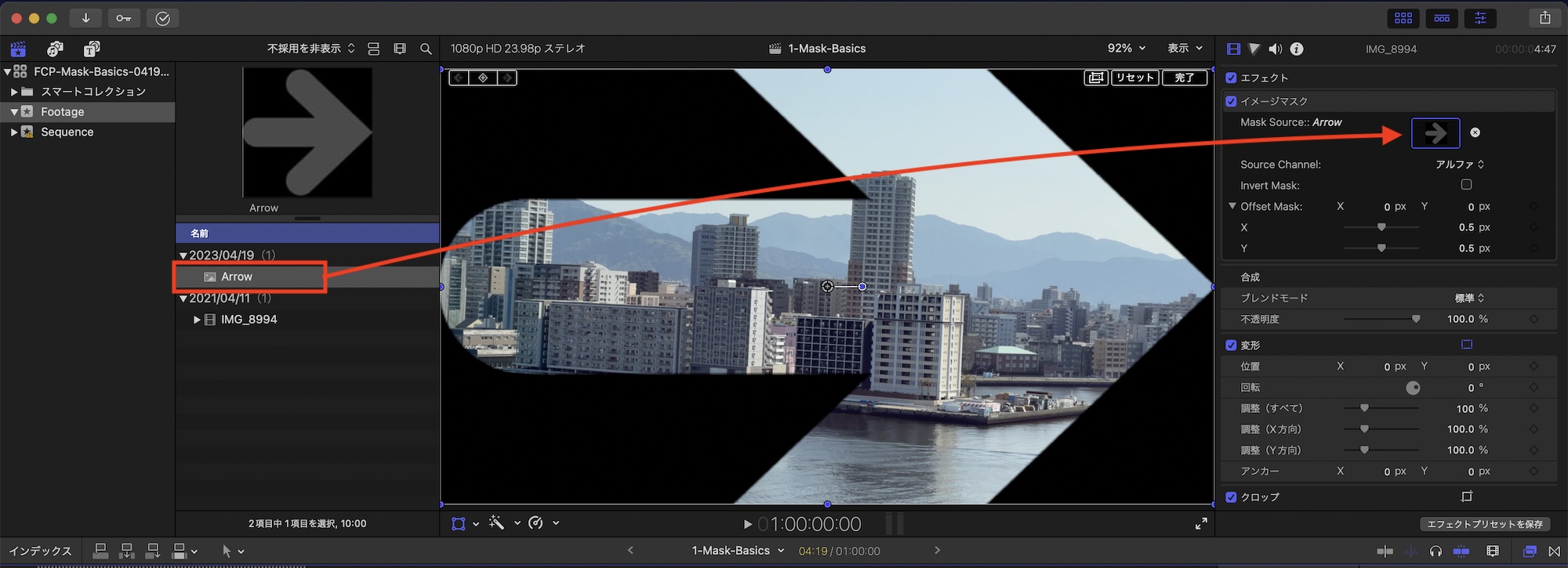 シェイプマスクとマスクを描画は一番利用するマスクで、基本的にこの2つを覚えればどのシーンの合成にも役立ちますが、Final Cut Proではこの他にも画像をマスクにする「イメージマスク」が用意されており、イラストの中に映像を表示させる場合などに役立ちます。