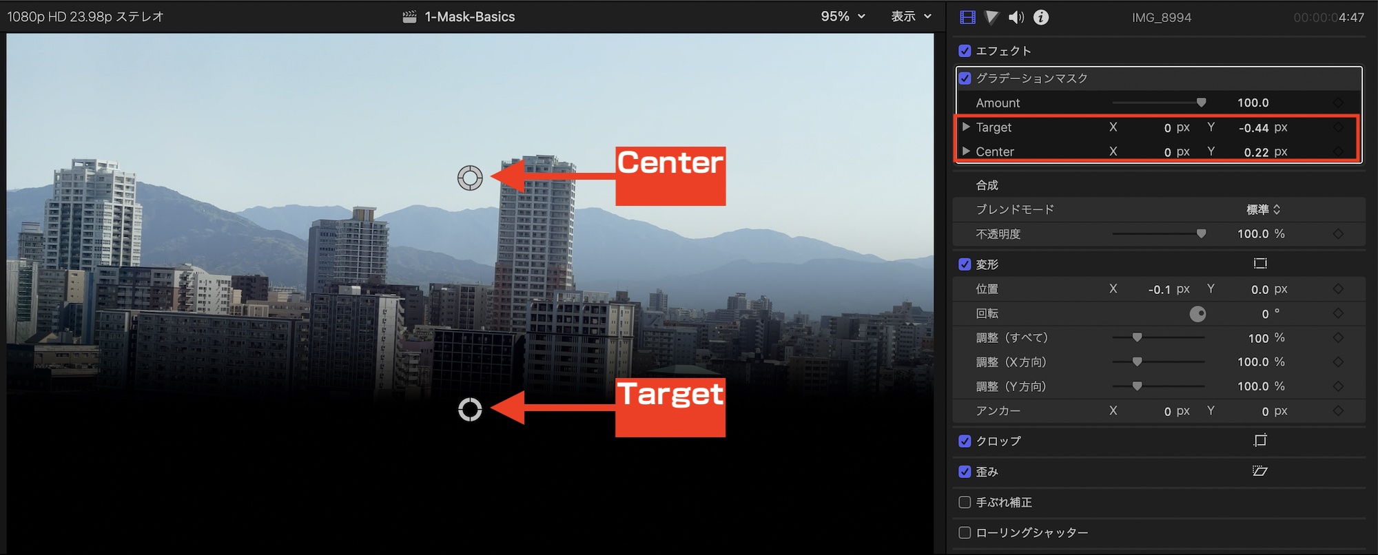 「グラーデーションマスク」はシェイプマスクと違い、フレーム全体かつ、1方向のみにマスクを適用するものです。空を別のクリップと合成する時などに役立ちます。