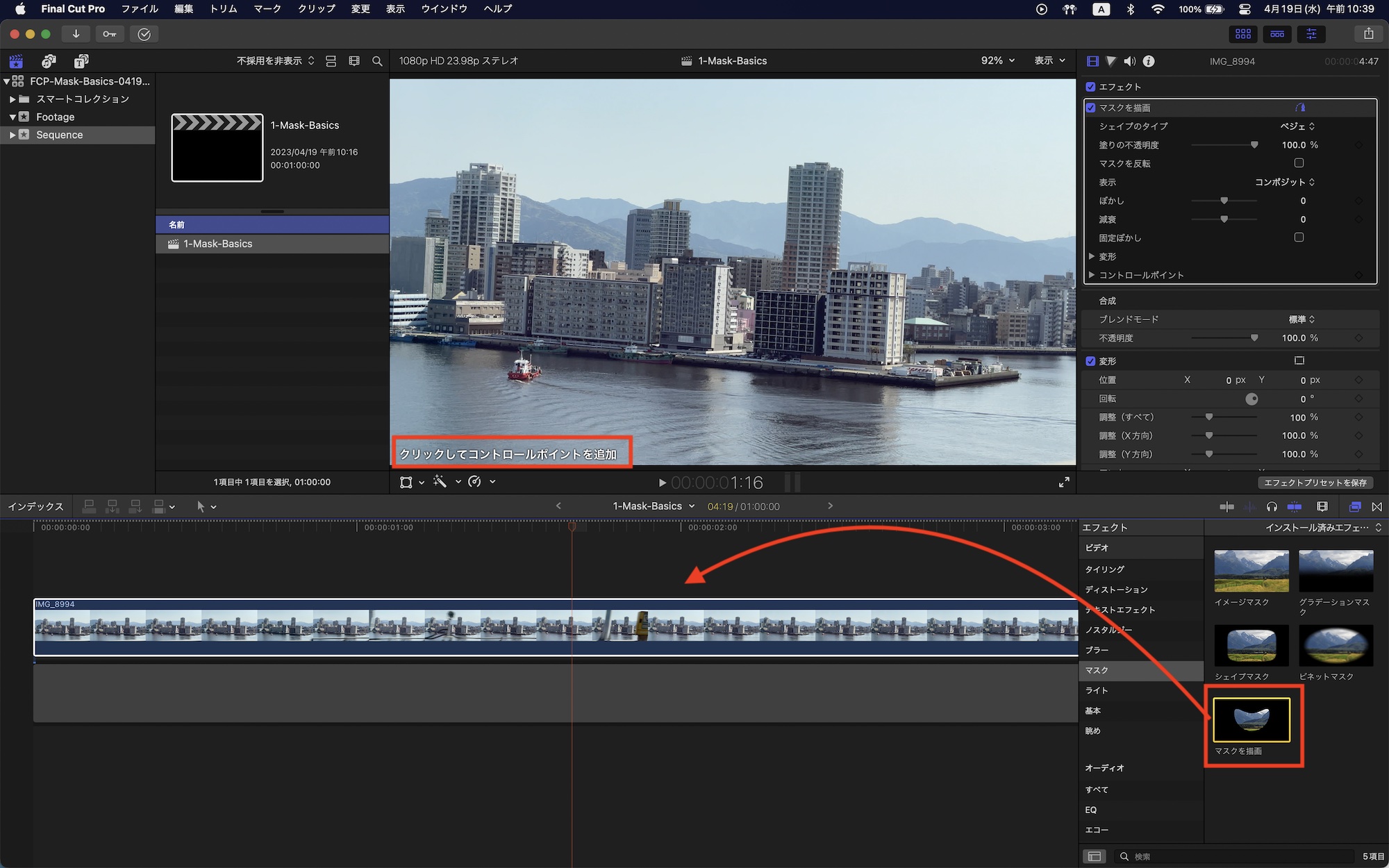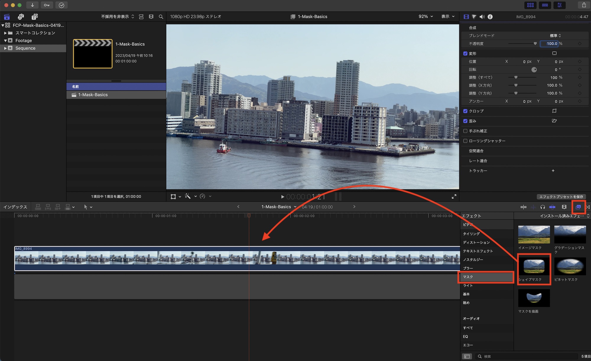 クリップ単体にマスクを追加する場合は、クリップを選択して、エフェクトブラウザの「ビデオ」、「マスク」の中にある項目から適用したいマスクをドラッグ・アンド・ドロップして追加できます。