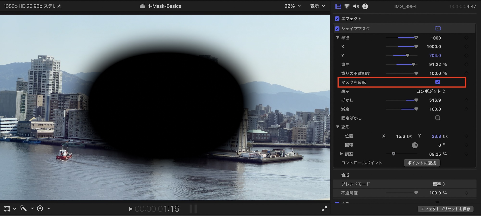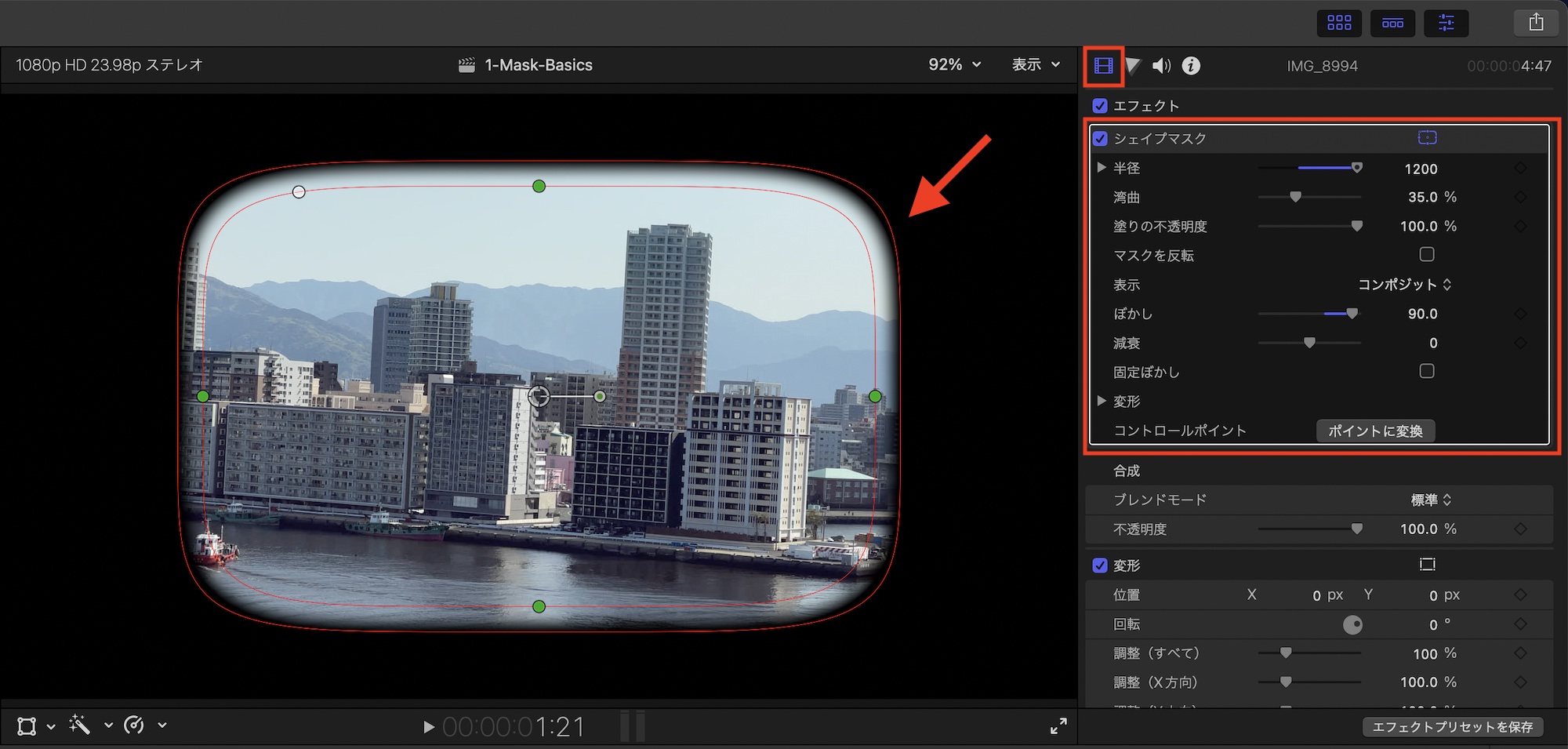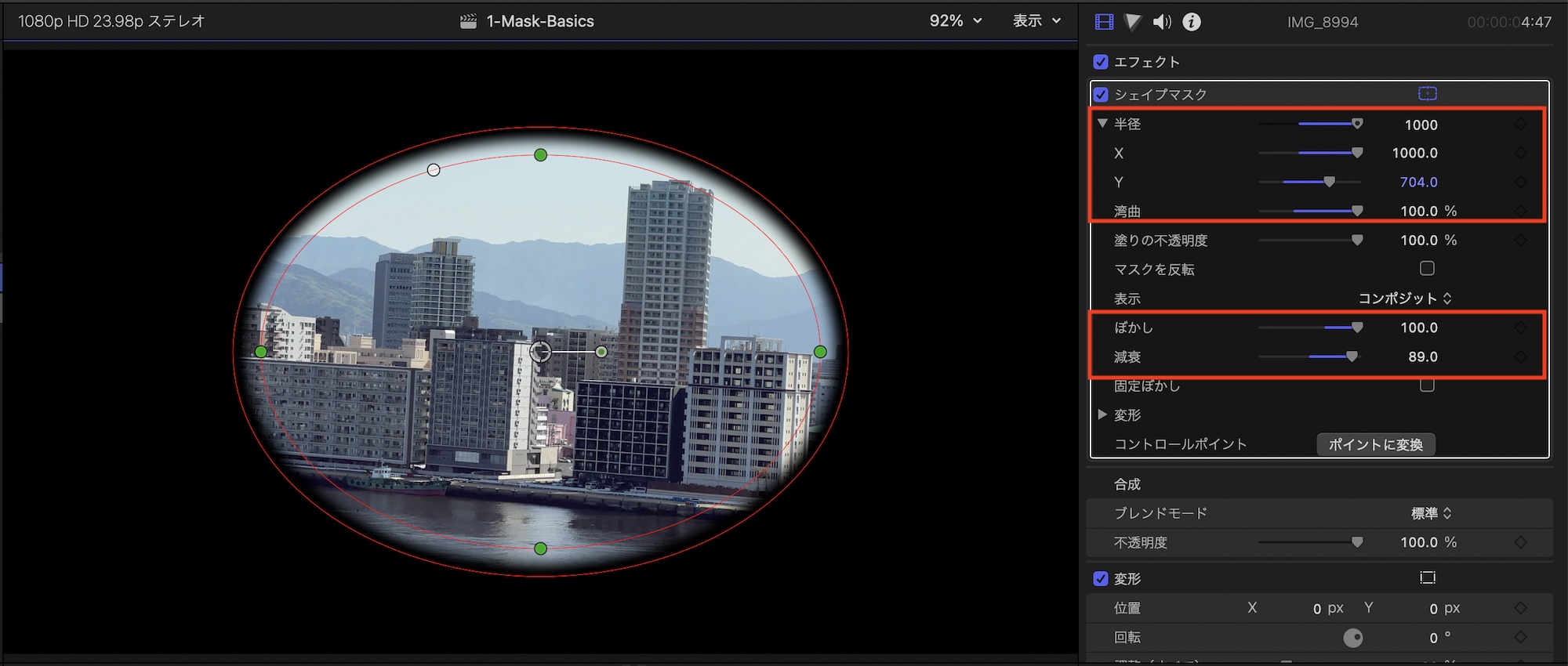 インスペクタ表示される「シェイプマスク」の項目から「半径」や「湾曲」を操作してマスクの形を変更したり、「ぼかし」と「減衰」の項目から合成をなじませるのに役立つ設定を行います。
