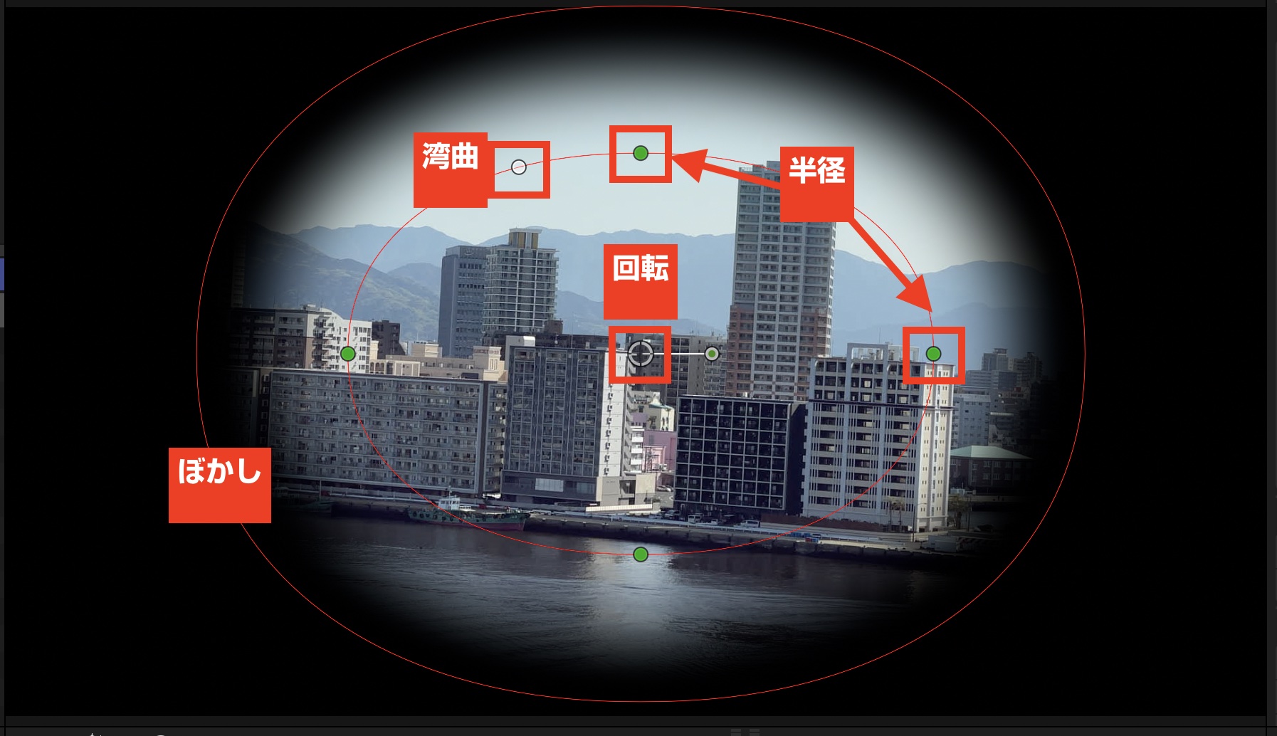 これらの操作はビューア上でも行うことができ、上下左右に表示されている緑色のアイコンが「半径」、白いアイコンが「湾曲」、中央が「回転」、内側の赤い円が不透明度が「100%」になる範囲で、外側の赤い円が「ぼかし」の範囲となります。ビューア上で操作するほうがより直感的に調整が行えるのでおすすめです。