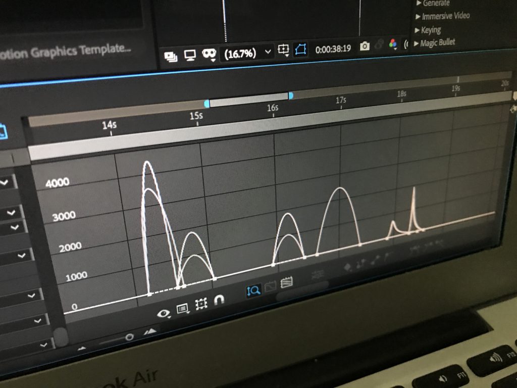 コンポジション上で出来ない時間の操作を可能のするのが、タイムラインに用意されているグラフエディター。モーションパスと同じくベジェ曲線などを活かすことで細かい設定を行うことが出来ます。