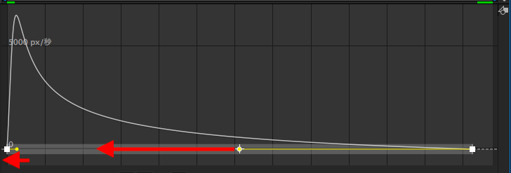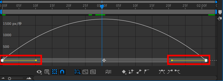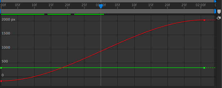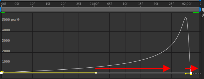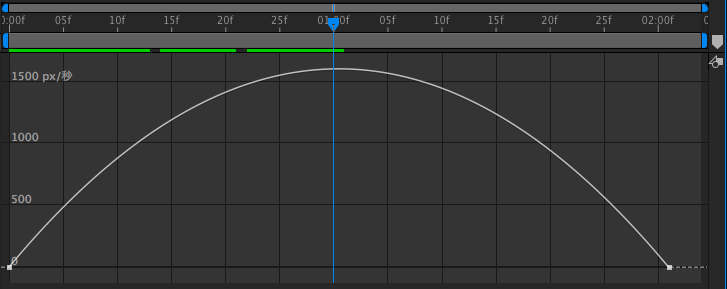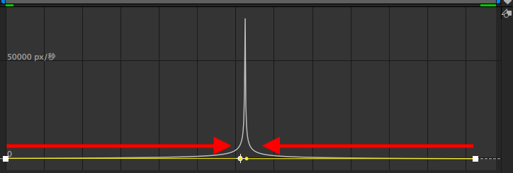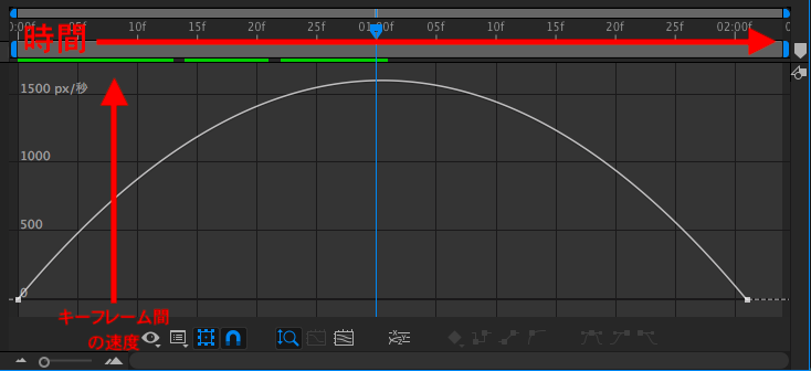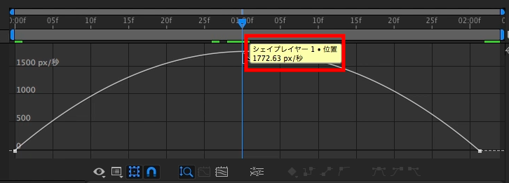 先ほど追加した2秒間掛けて左から右に動くアニメーションを例にしてみると、0秒の時点で0px/秒、中間である1秒は1772px/秒のピークに達し、2秒では0px/秒になるように減速するといった、均等な動きになっているのがわかります。
