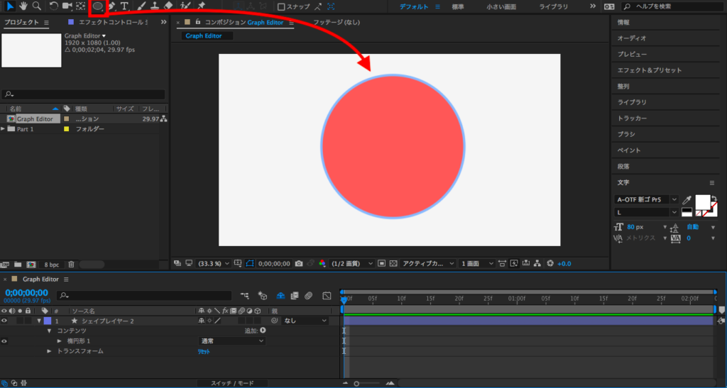値グラフではオブジェクトのキーフレーム間におけるプロパティの変更を行えるものです。分かりやすいように新しく楕円形ツールを使用して円のシェイプを作ってみましょう。