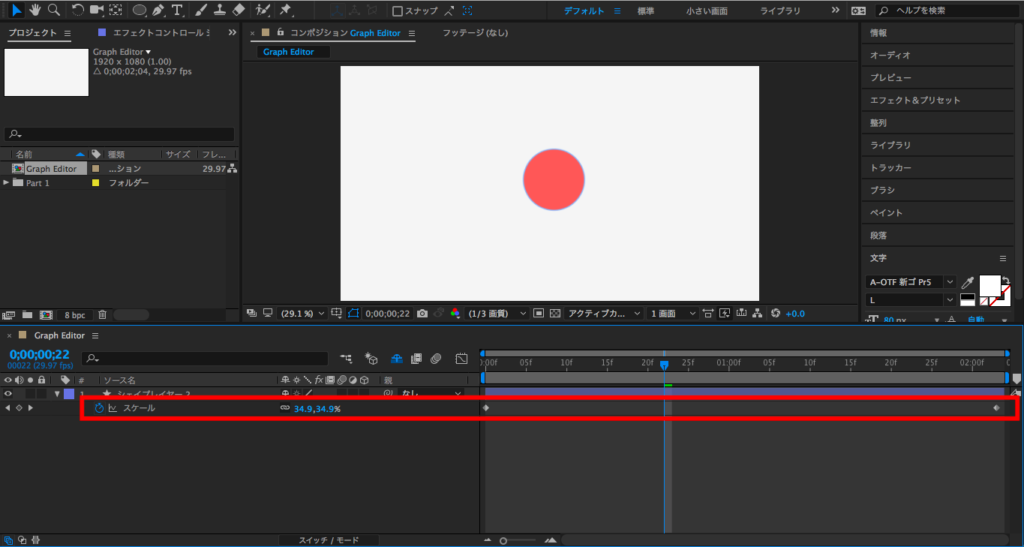 こちらは2秒間のアニメーションでスケールを0%から100%に変化するシンプルなものにしました。キーフレームを選択して、先ほどと同じようにF9(Fnキー+F9)または右クリックでイージーイーズをクリックしてイージングを行います。