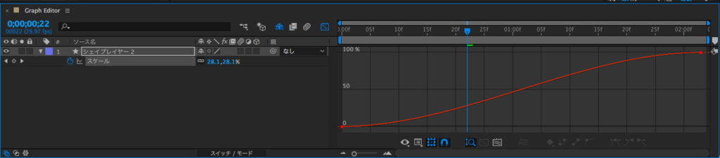 するとこの様な左から右にかけて大きくなるグラフが表示されます。これはキーフレーム間におけるスケールの大きさを表しているものです。