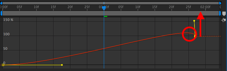 グラフをクリックするとベジェ方向ハンドルが登場します。今回はシンプルに最後のキーフレームのみ選択して、左右ではなくハンドルを少し上に持っていって小さな山を作ってみましょう。