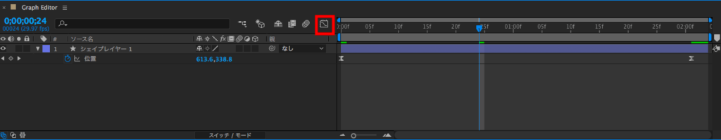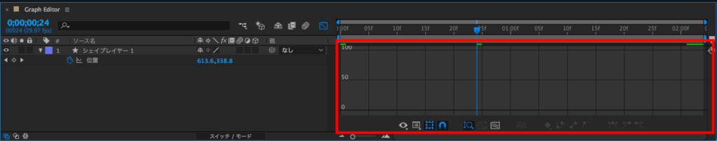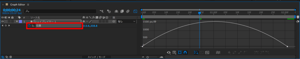 先ほど追加したシェイプレイヤーの位置(ショートカットキー:P)を選択することで、そのプロパティのグラフを見ることが出来るようになります。