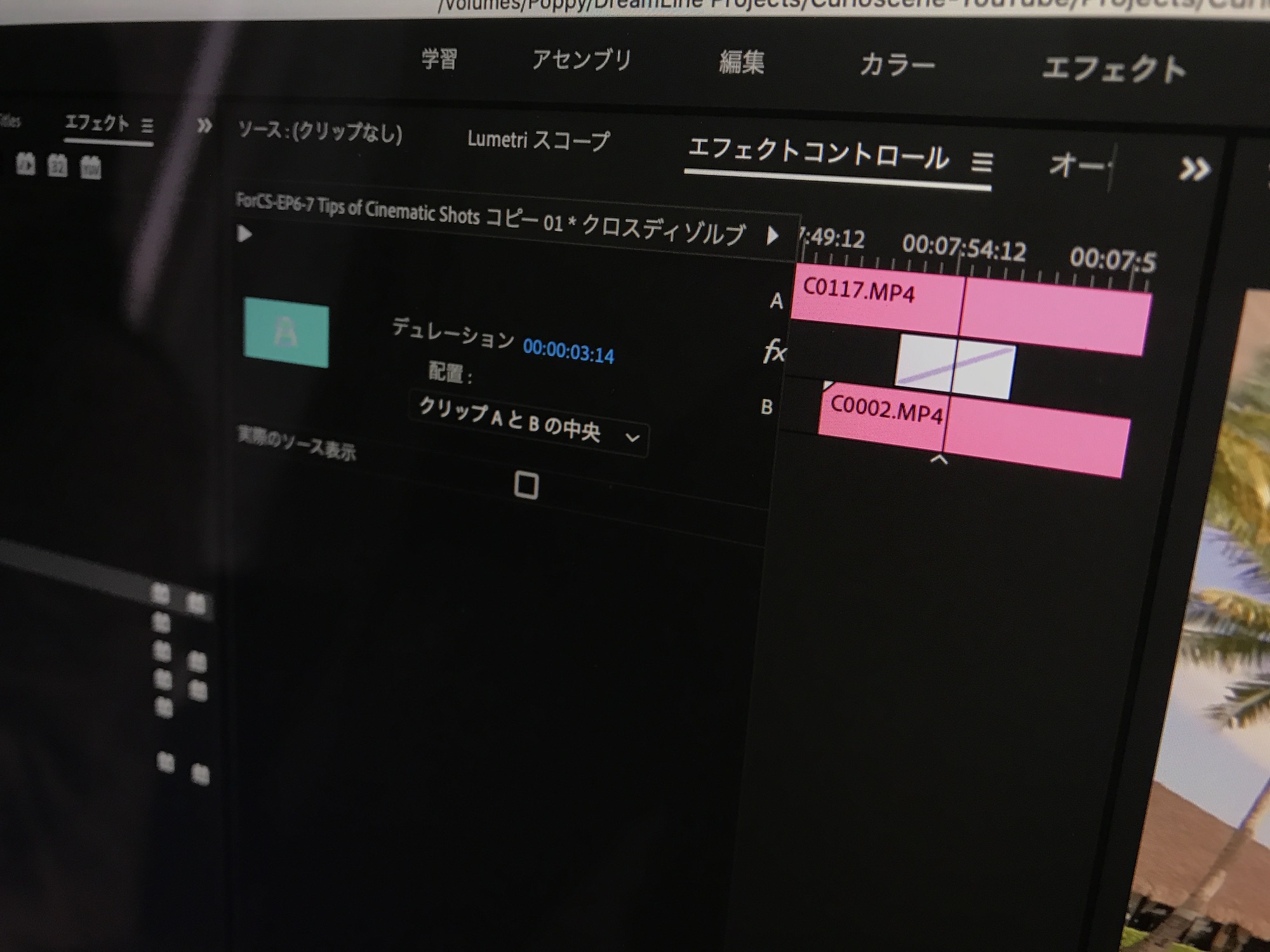 ディゾルブはトランジション感が出るので手軽に導入できる反面、使いすぎると逆にチープさや時代遅れ感が出てしまう可能性があるので「使い所が難しいトランジション」でもあったりするのです。