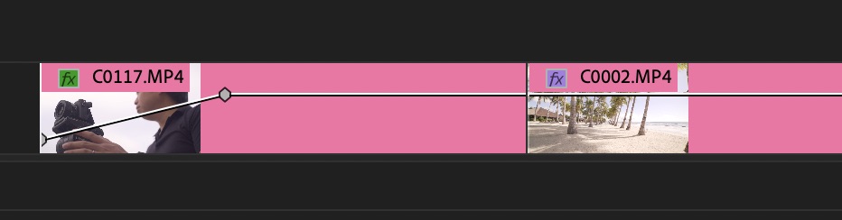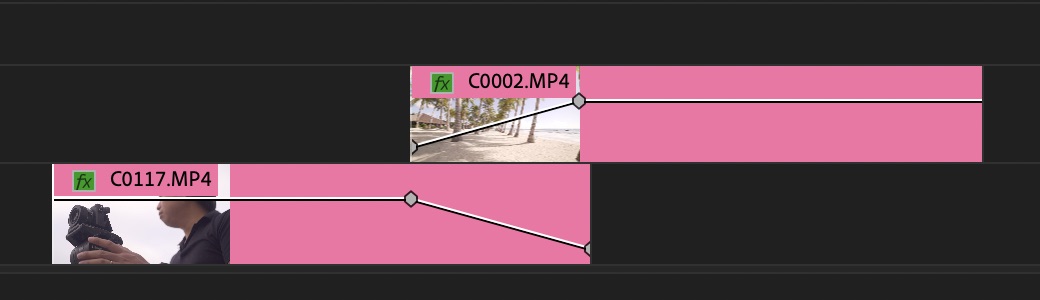 クリップを上下に配置し、最初のクリップの不透明度が0%から100%に次のクリップが同じタイミングで0%から100%になるように設定し、交差するトランジション。クロスフェード(Crossfade)とも呼ばれます。