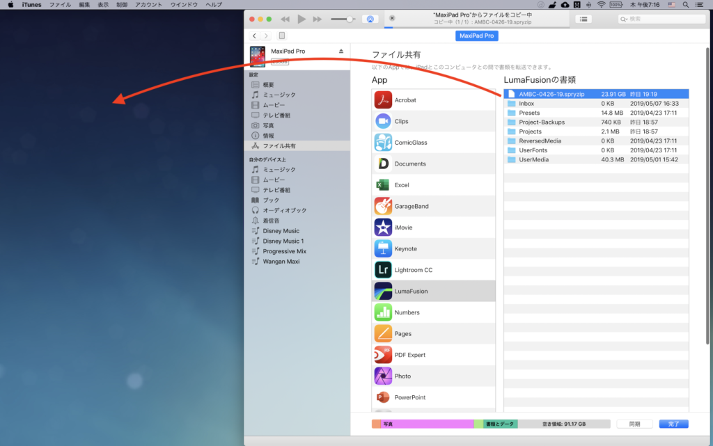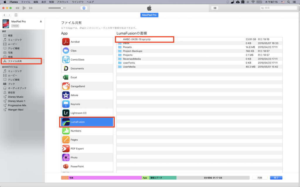 「iTunesファイル共有」を選択した場合、iPadをパソコンに接続した後でiTunesの「ファイル共有」の項目から「LumaFusion」を選ぶと先ほど指定した名称のアーカイブファイルが保存されています。