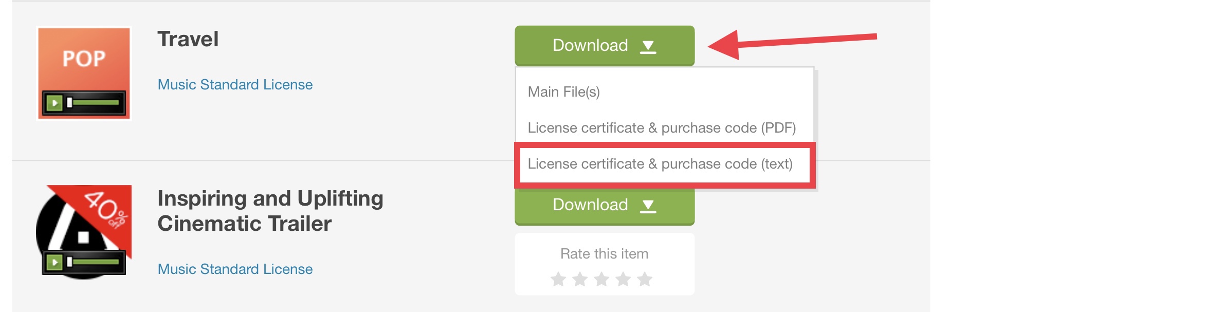 購入済みのアイテムが現れるので、動画に使用した音楽にある「Download」ボタンをクリックし、ドロップダウンにある「License certificate & purchase code(text)」を選択してTXTファイルをダウンロードします。