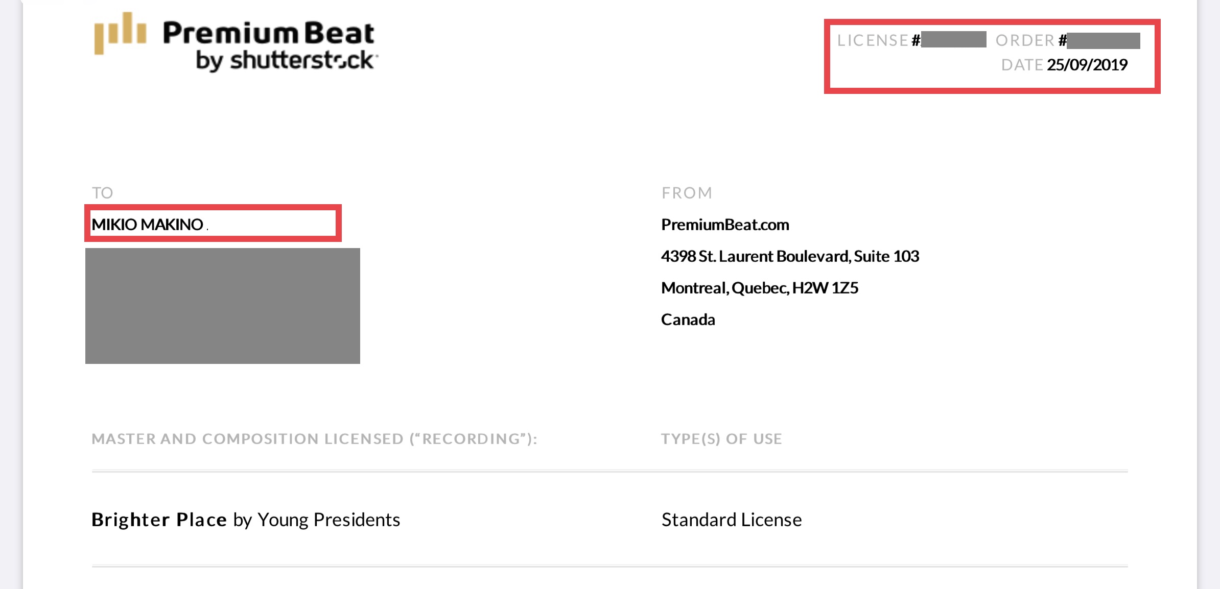こちらの動画で使用している音楽はロイヤリティーフリー楽曲を提供しているPremium Beat(www.premiumbeat.com)から入手しており、私は9/29/2019に"Song Title by Artist"を購入しました。以下はそのライセンス情報となります。