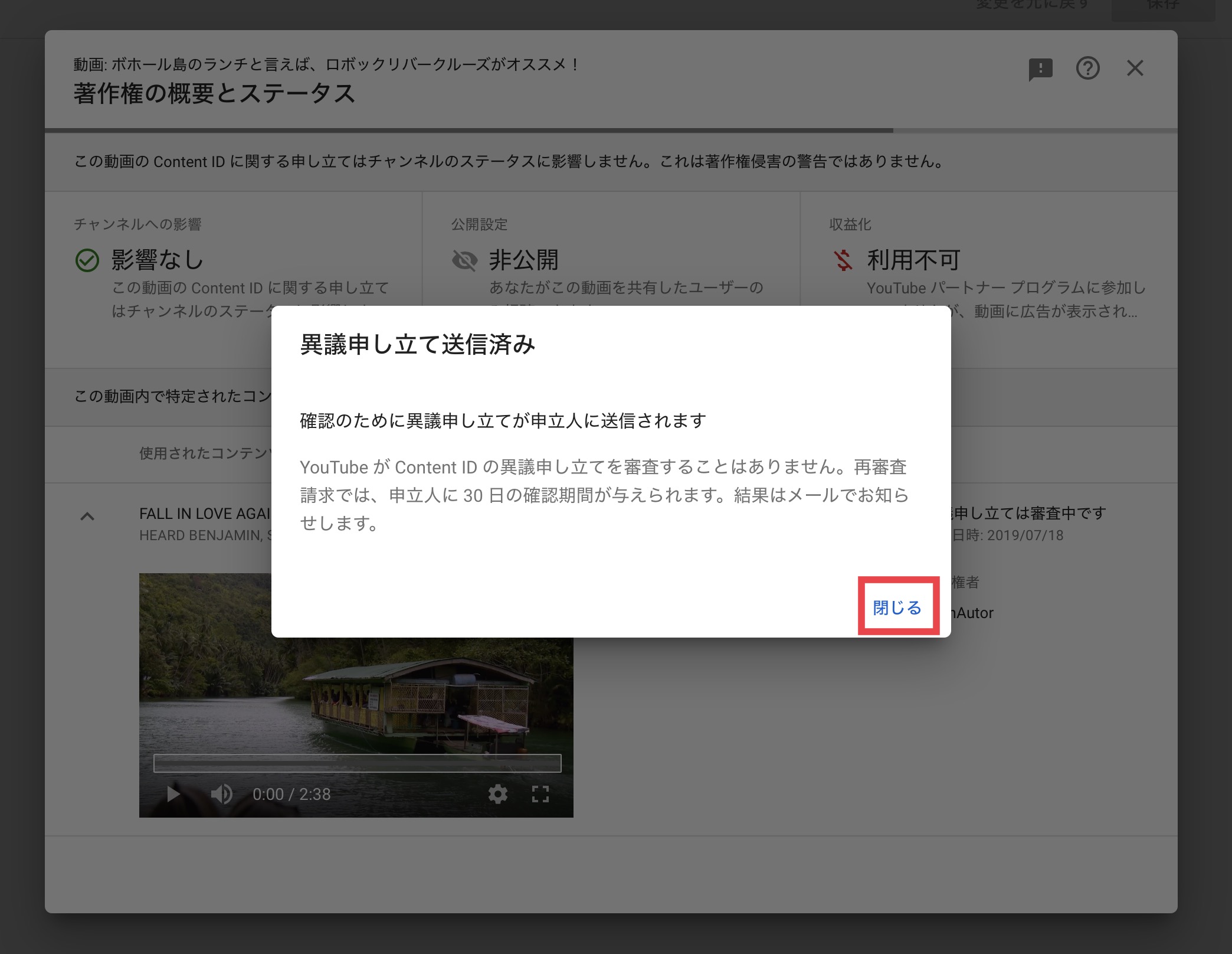 YouTubeによると異議申し立て後の結果はメールに送られると記載されていたものの、筆者の場合は知らないうちに申し立てが無くなっており、クリアな状態になっていました。