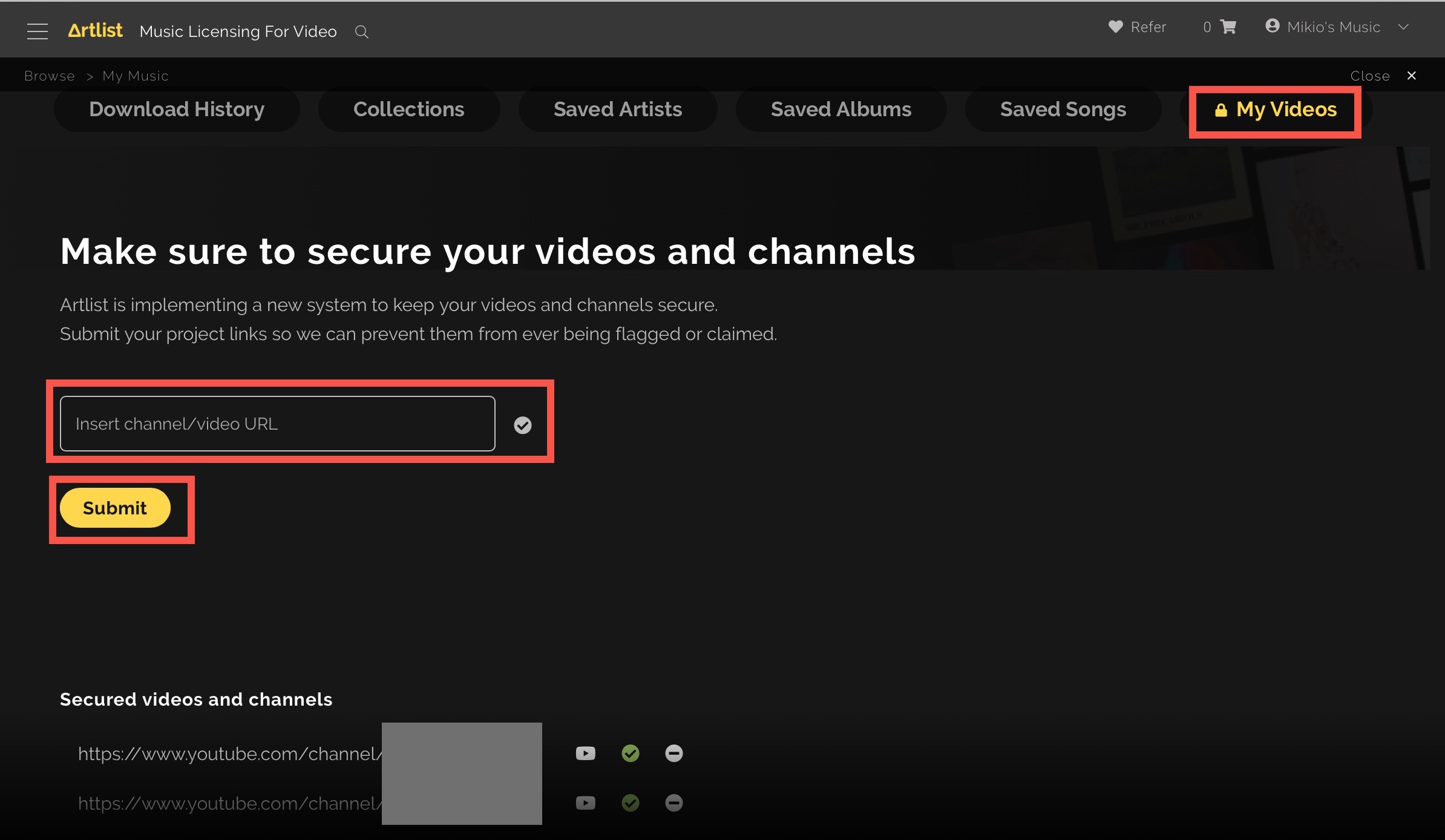 「Insert channel/video URL」の項目にArtlistの素材が使われているチャンネルまたは動画のURLをペーストし、「Submit」ボタンをクリックすれば完了です。