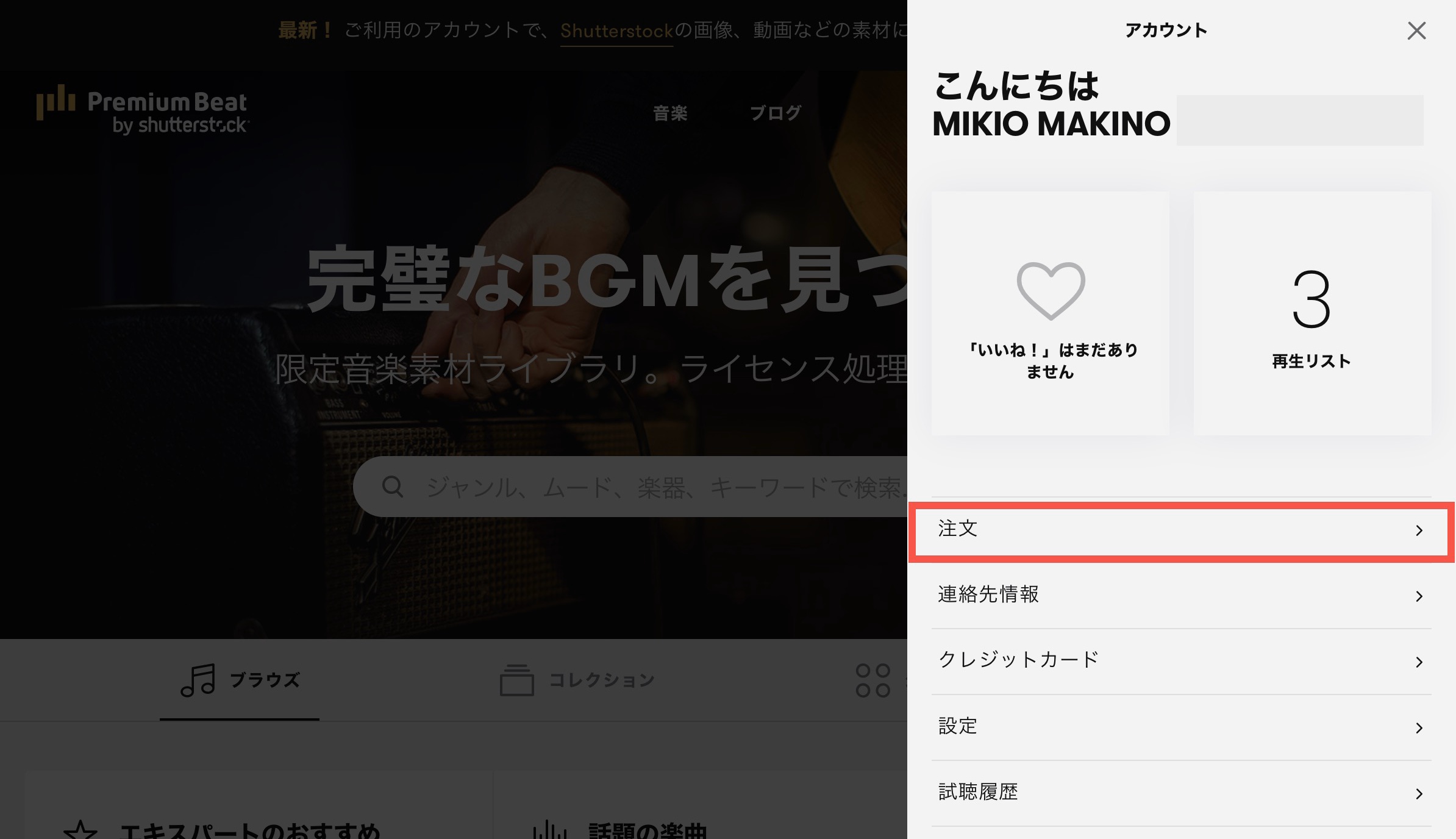 右上のユーザアイコンをクリックして、サイドメニューから「注文」をクリックしましょう。