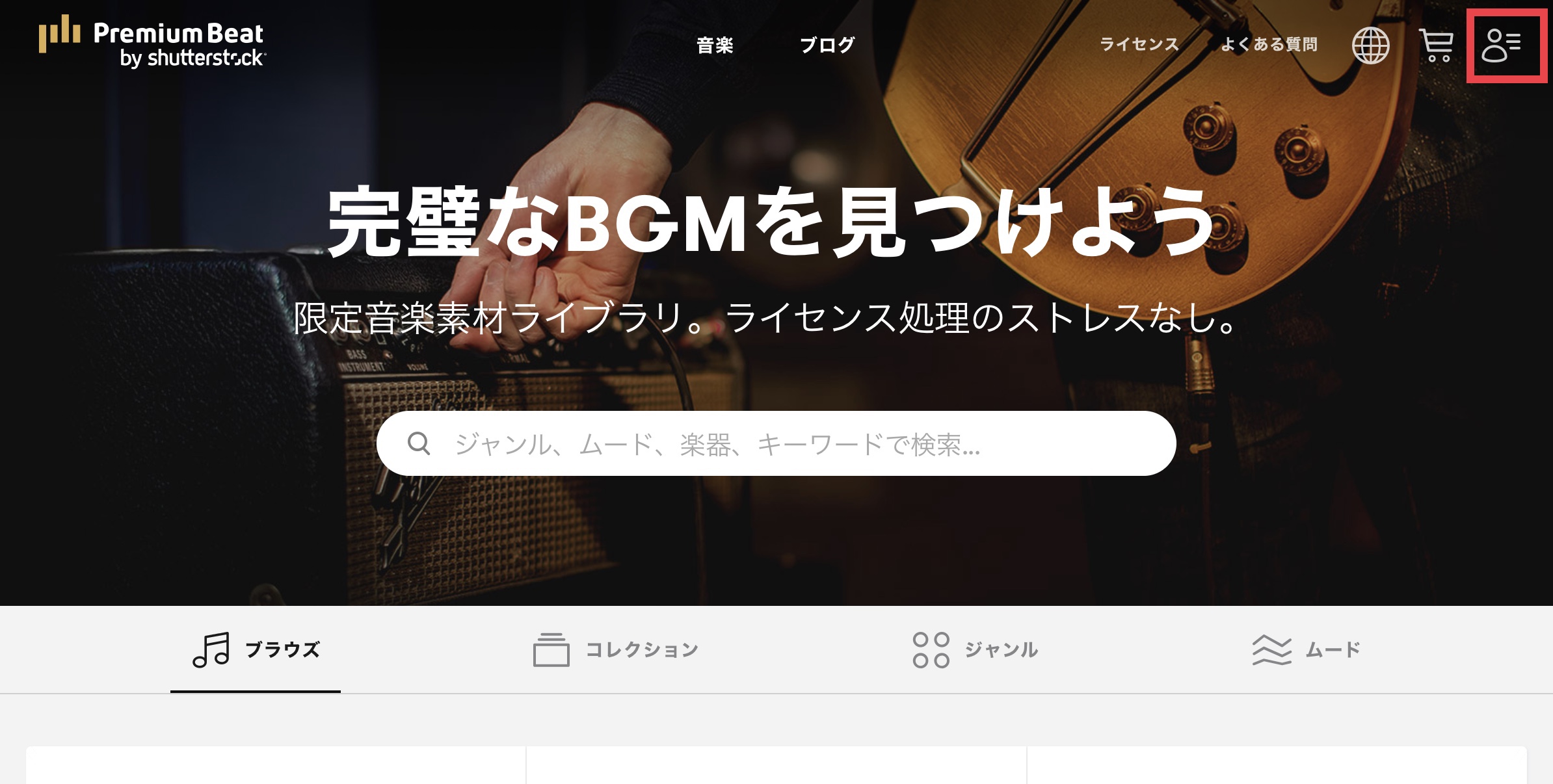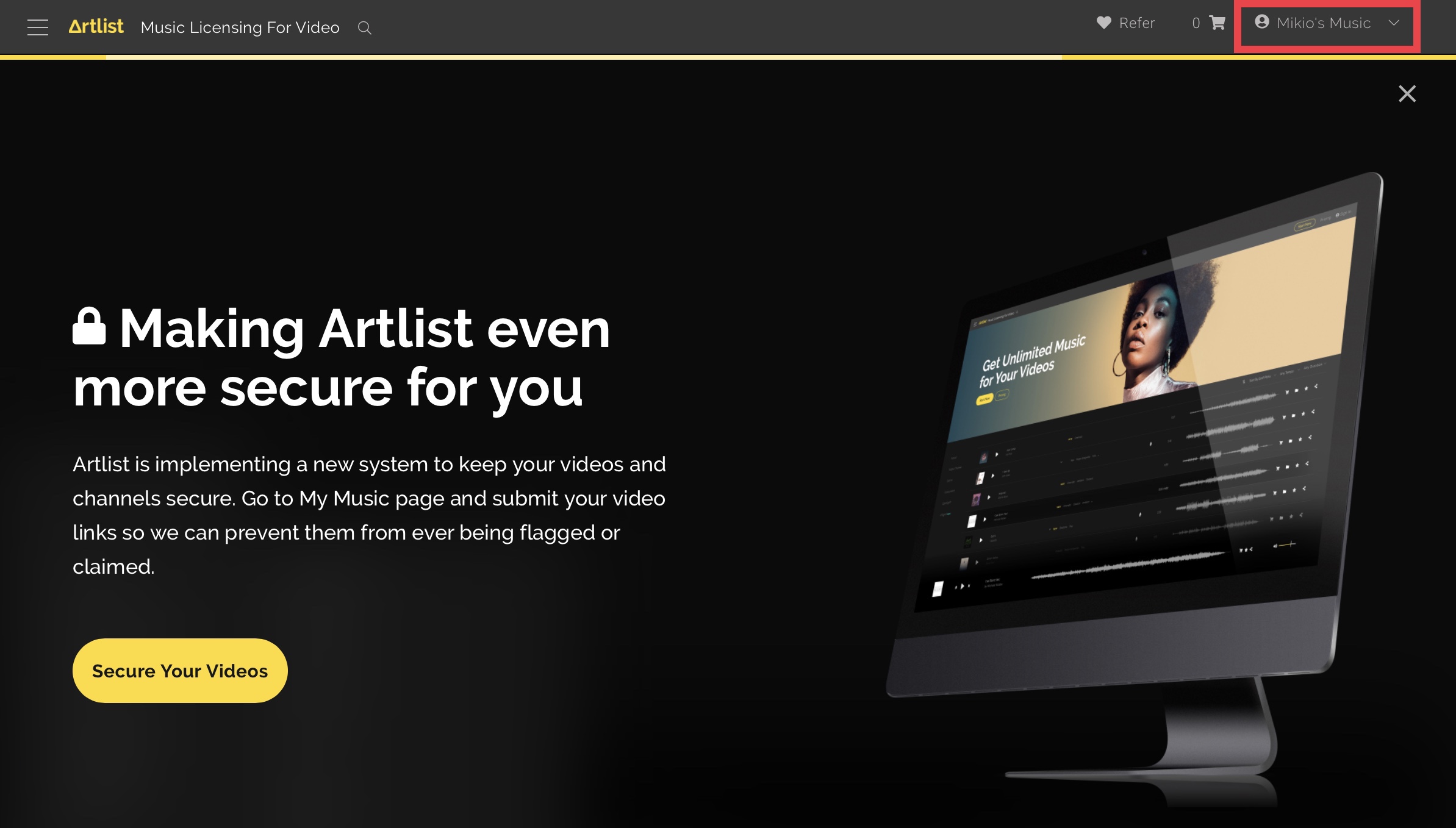 Artlistにログインして右上にある「ユーザー名’s Music」の項目から「Library」をクリックし、「Library」のページを開きます。