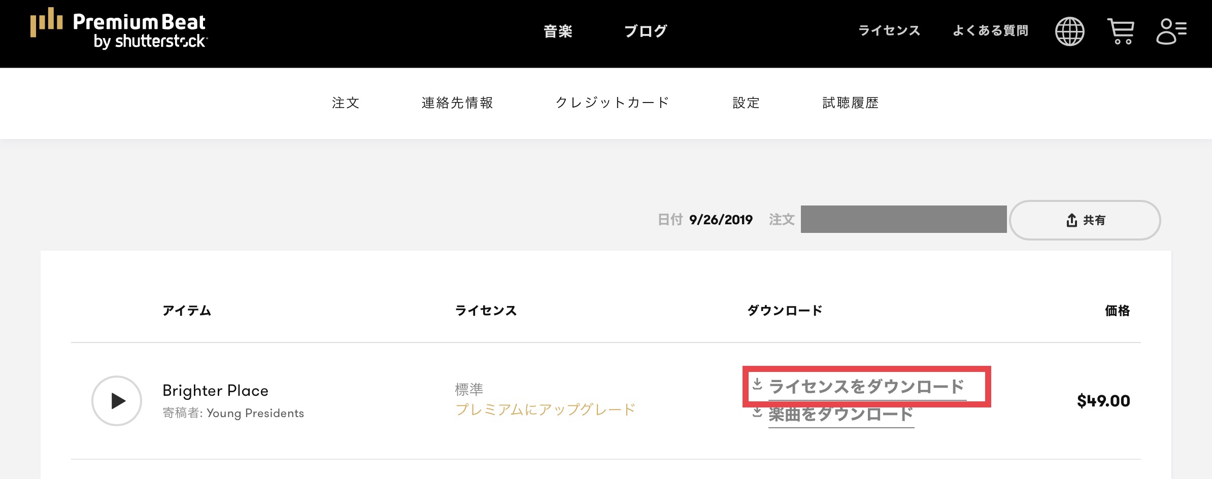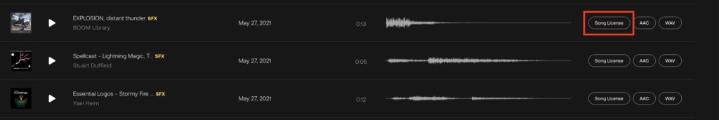 ダウンロードした曲が一覧で表示されるので、ライセンスを入手したい音源にある「Song License」をクリックしてPDFを入手します。