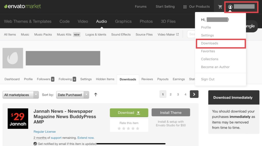 AudioJungleにログインし、右上のユーザー名から「Downloads」をクリックします。