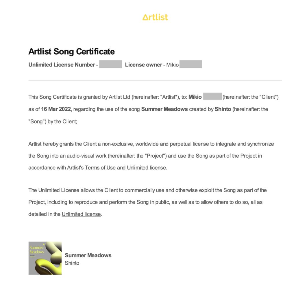 このように表示されると焦ってしまいますが、ライセンスを保有していれば問題はありません。筆者が使用したBGMもArtlistで入手したものなので、ライセンスは有効な状態です。