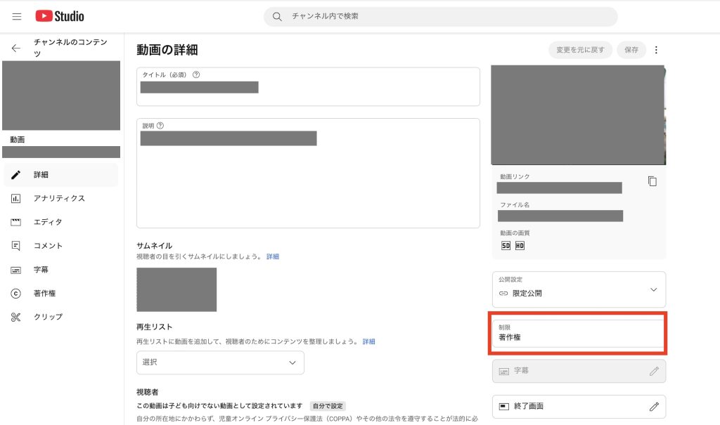YouTube Studioの動画詳細画面から「制限」をクリックして、内容を展開します。