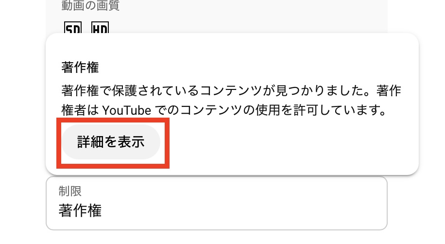 「著作権で保護されているコンテンツが見つかりました。著作権者はYouTubeでのコンテンツの使用を許可しています。」と表示されるので、その下にある「詳細を表示」をクリックします。