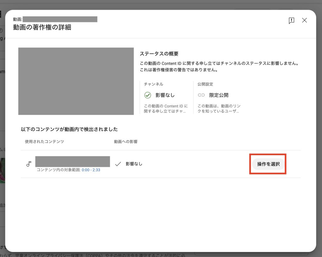 動画内で使用している楽曲の詳細が現れるので、問題がなければ「以下のコンテンツが動画内で検出されました」の「操作を選択」をクリックしましょう。