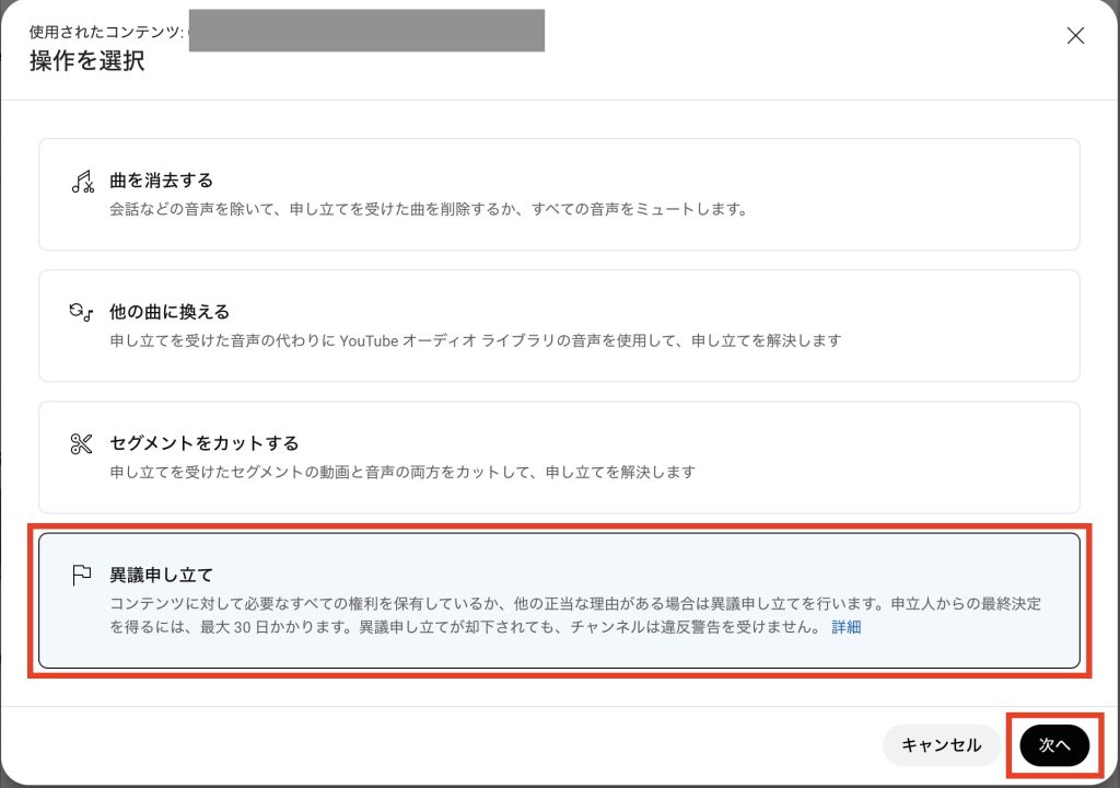 「操作を選択」の項目で「異議申し立て」を選択して、「次へ」をクリック。