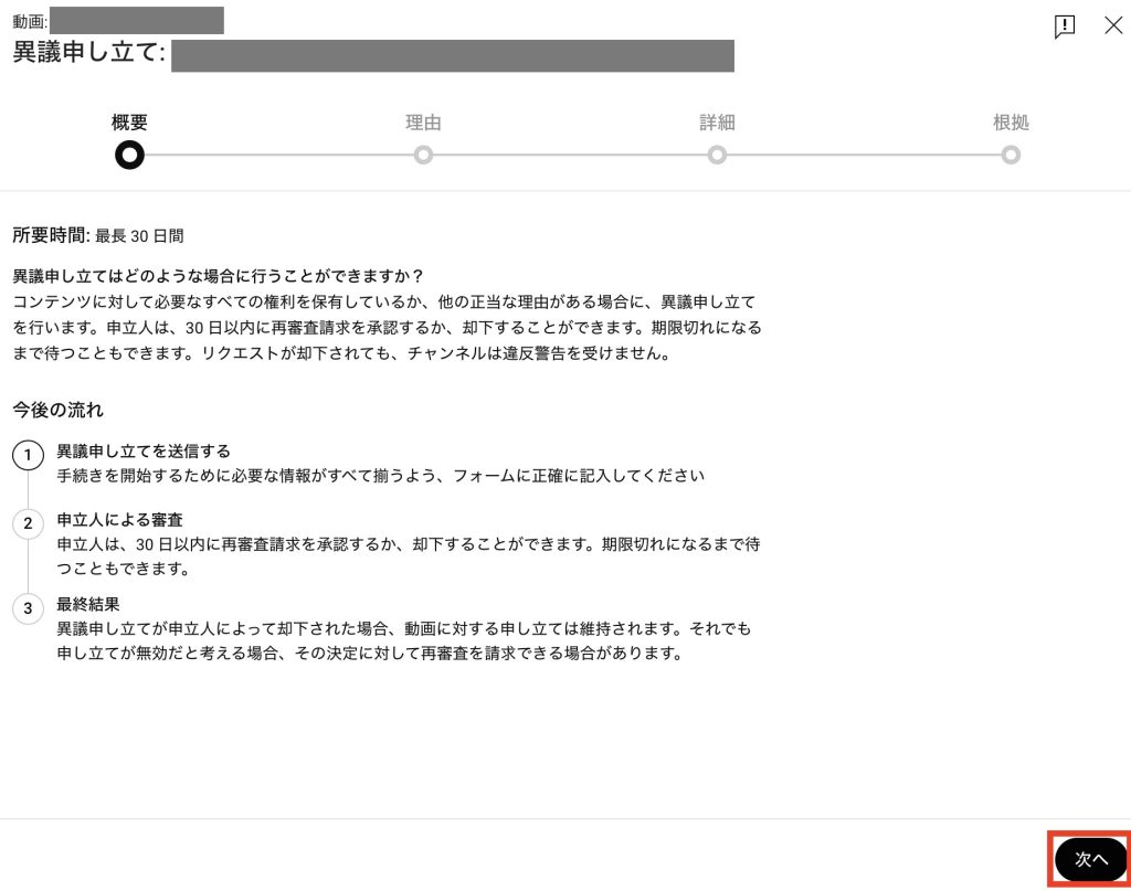 「概要」では異議申し立ての流れが確認出来ますが、特に操作する項目はないので、「次へ」をクリック。