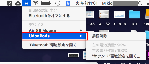 まずはMac/WindowsのBluetooth設定から、AirPodsなどのワイヤレスイヤホン・ヘッドホンが接続されていることを確認します。筆者の場合はAirPodsを「UdonPods」の名前に設定してあるため、その名前が表示されています。