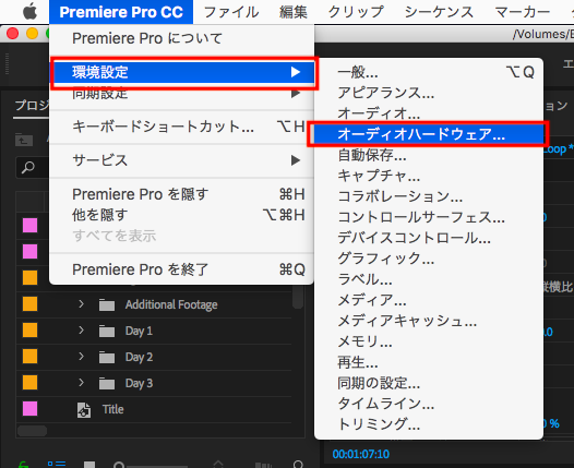 Bluetoothでの接続を確認した後はPremiere Proの設定を行います。「環境設定」> 「オーディオハードウェア」をクリックします。