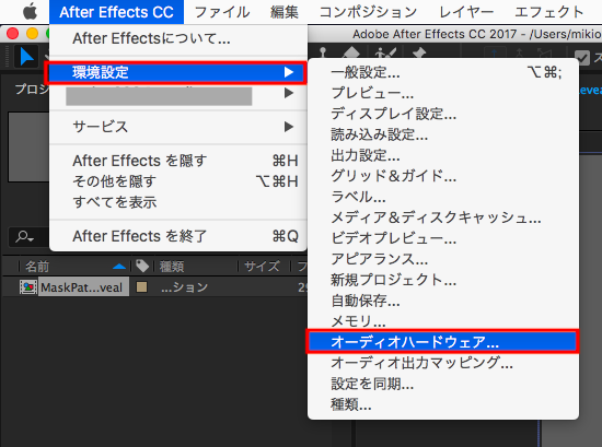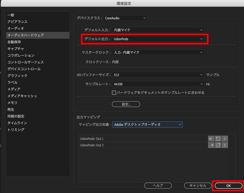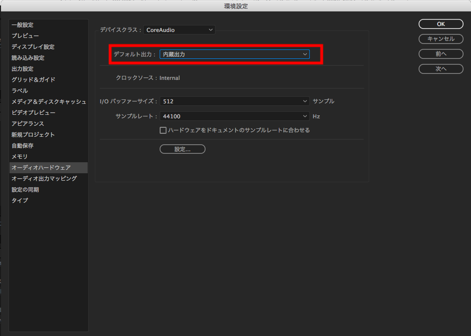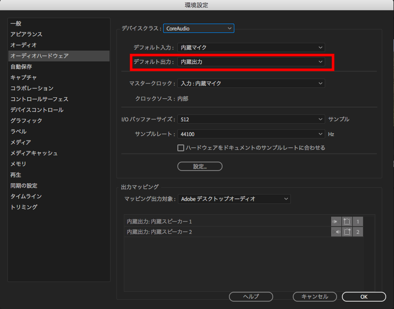 こちらもPremiere Proと基本的に同じ操作になります。位置が少しずれるものの、「環境設定」> 「オーディオハードウェア」を選択して、「デフォルト出力」の項目を接続中のデバイスに変更します。