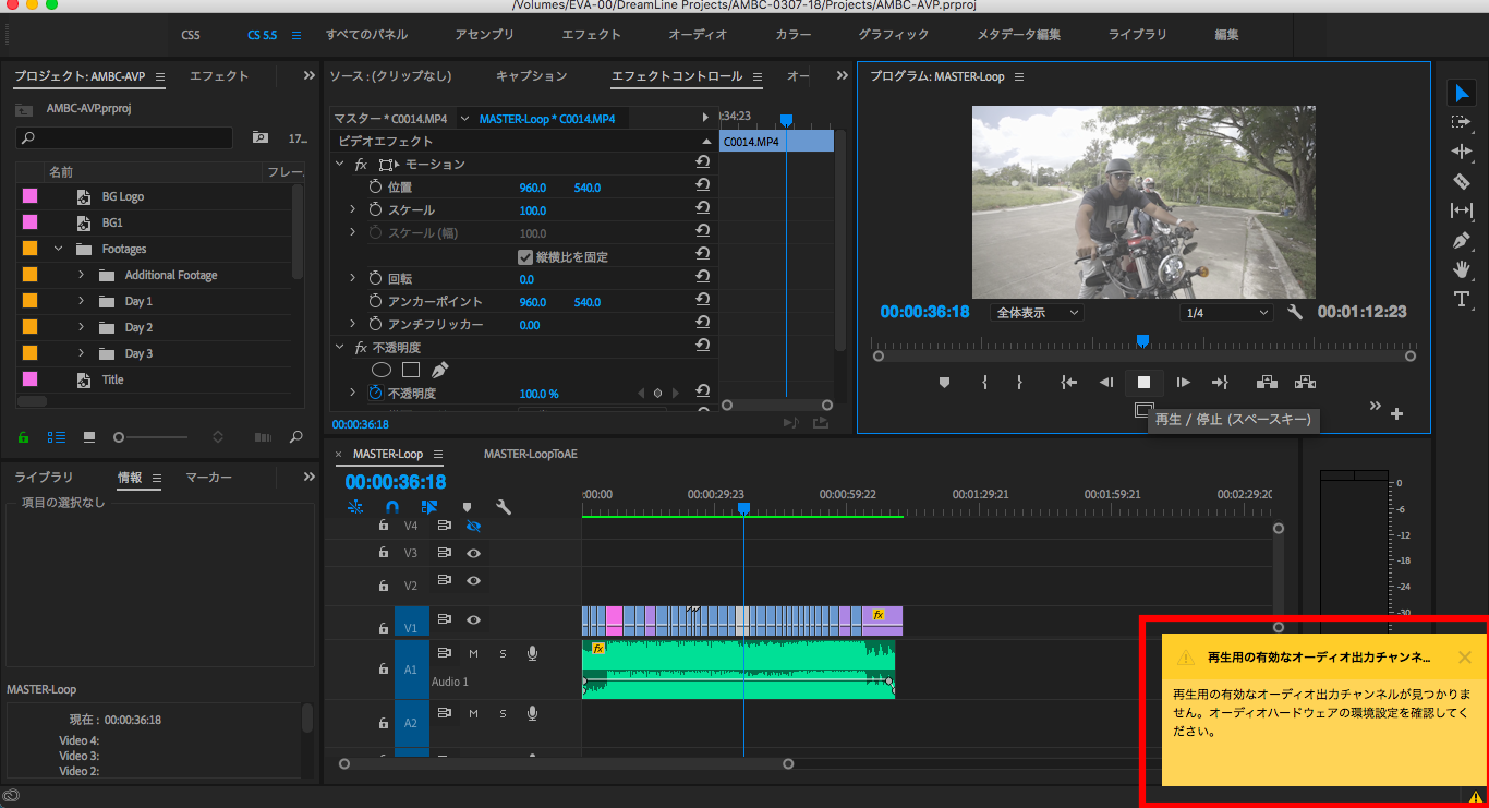 また、Bluetoothデバイスが接続されていない状態でPremiere Proを開くと右下に「再生用の有効なオーディオ出力チャンネルが見つかりません」と出てくるので、上記の環境設定に戻って「内蔵出力」に変更し、Bluetoothを接続した後でまた変更をすると良いでしょう。最初から接続されてあれば、このエラーを回避することが出来ます。