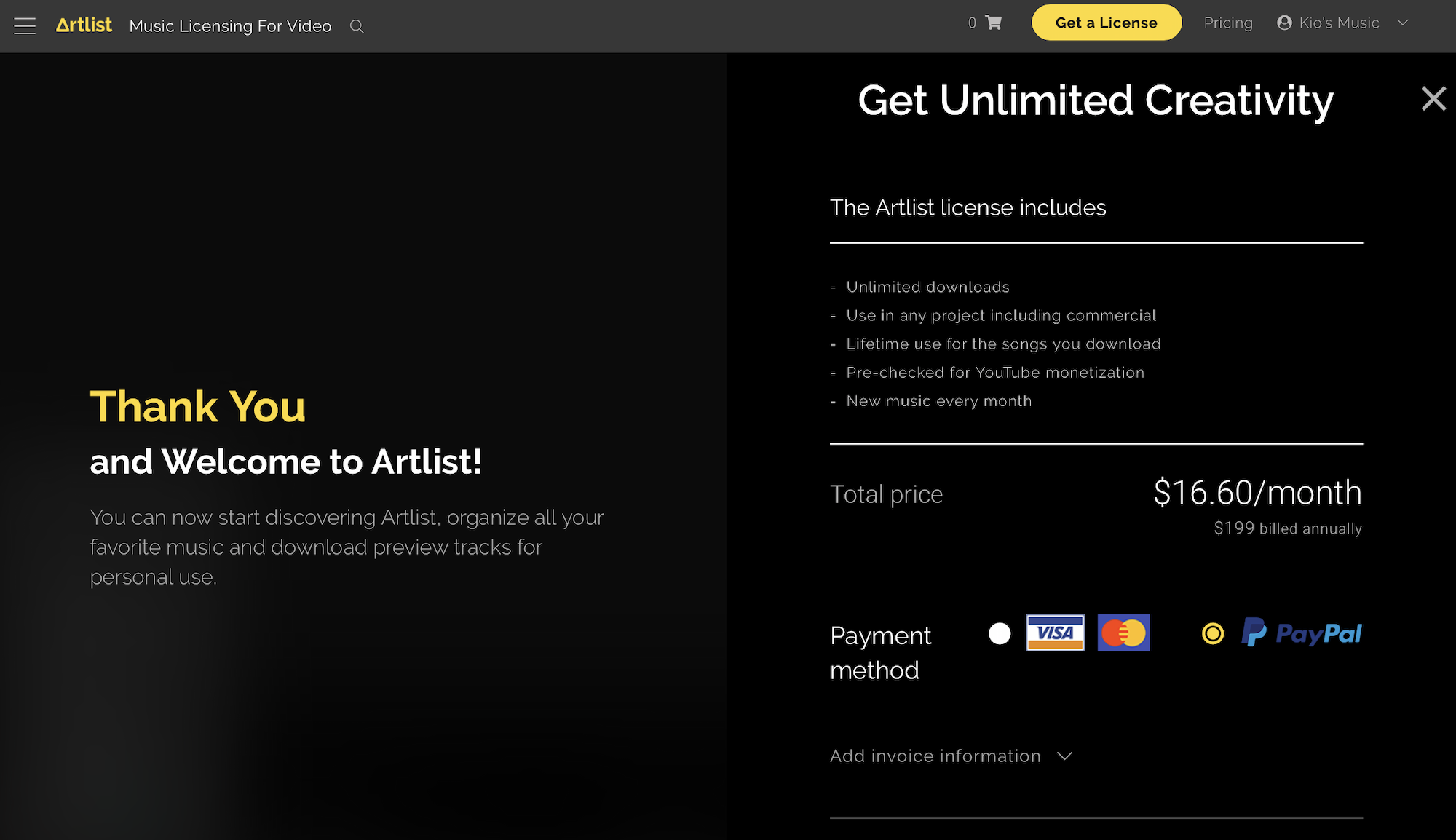 その後で「Thank You」のページが現れるので、一覧から音楽を確認するのも良し、すぐ横にある「Get a Liscense」からサブスクリプションに登録する事も可能です。
