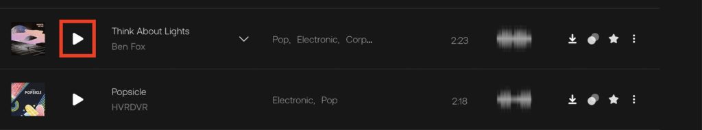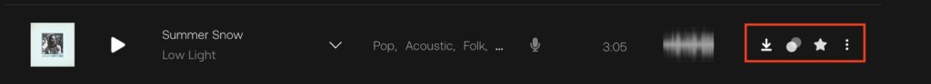 Artlistの検索などで曲を一覧表示させると、リストの右側にいくつかのアイコンが用意されており、曲をコレクションに保存したりダウンロードすることができます。
