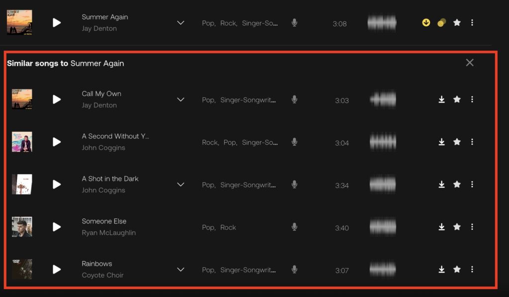 クリックすると選択した音楽の下に「Similar Songs to~」の項目が現れ、似た曲をリストとして表示してくれます。
