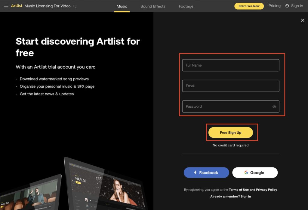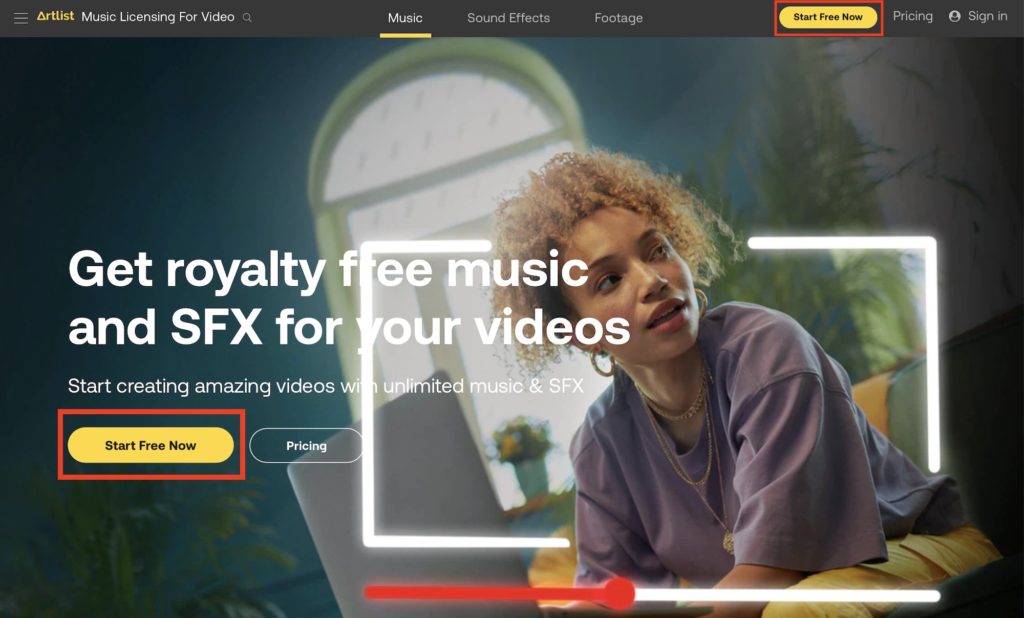 Artlist.ioにアクセスし、上部にある「Start Free Now」のボタンをクリックしましょう。当サイト経由でArtlistに申し込むと1年のサブスクリプションの後に追加される2ヶ月分の無料特典を受けられます。14ヶ月のうちの2ヶ月は無料になるので、まだArtlistを使ったことがなくて、より長く利用したい方はぜひ下のリンクから登録してみてください。