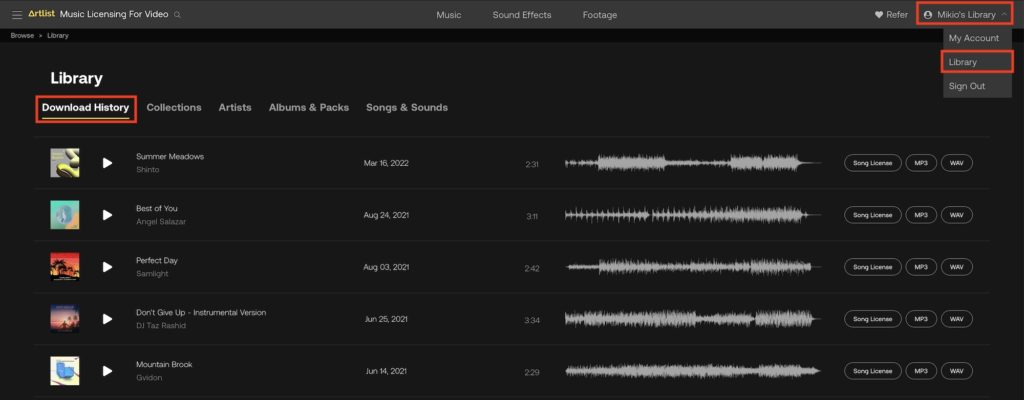 なお、ダウンロード済みの全ての音源を確認するには右上の「ユーザー名's Library」の「Library」にある「Download History」から行えます。この画面ではMP3またはWAV形式の音源の再ダウンロードや音源ごとのライセンスを入手できます。