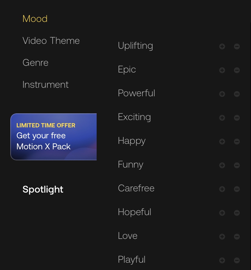 画面左にある絞り込み検索では「Mood(ムード)」、「Video Theme(ビデオテーマ)」、「Genre(ジャンル)」、「Instrument(楽器)」で分けられているので、項目を選んで表示する事もできます。