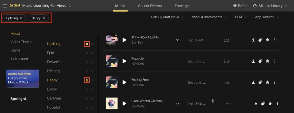 検索結果をさらに細かく表示させることも可能で、「Sort by Staff Picks」の項目から新しい曲順などの表示方法を変えたり、「Vocal & Instruments」からボーカルあり、なし(Instrumental)に変更したり、「BPM」と「Any Duration」から曲のBPMや長さを指定できます。