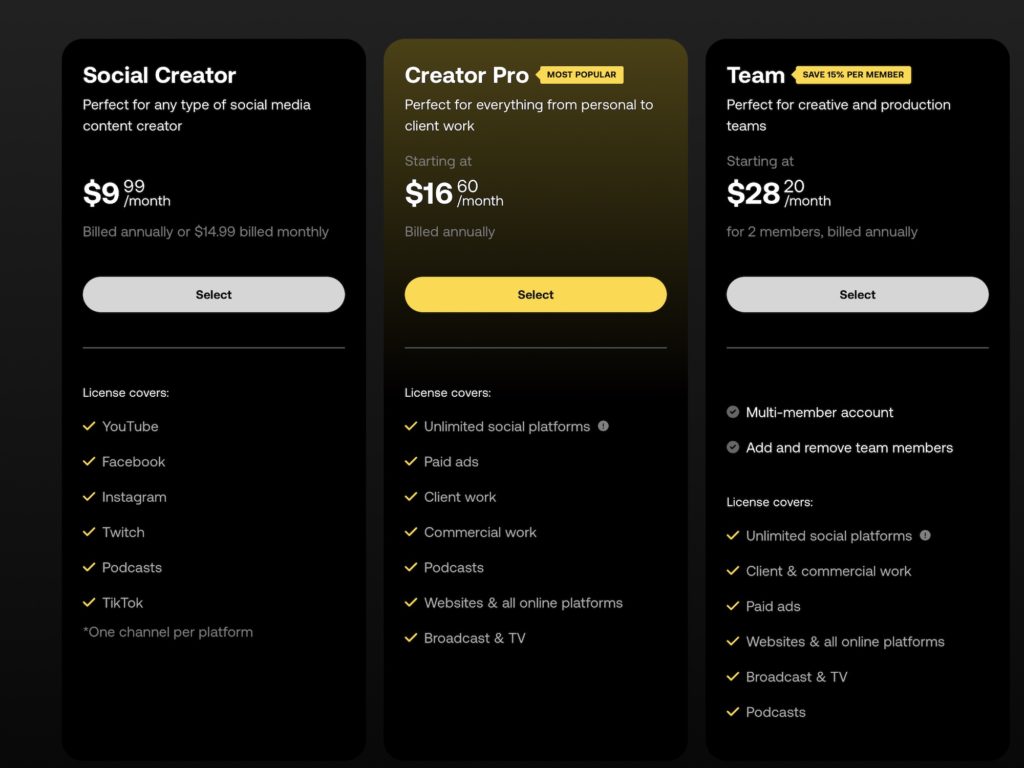 サブスクリプションの価格はプランによって異なり、YouTubeやInstagram、TikTokといった各SNSの1チャンネルまでカバーするSocial Creatorプランが9.99ドル、コマーシャルを含むクライアントの案件やテレビへの放映もカバーするCreator Proプランが16.60USドル/月になります。
