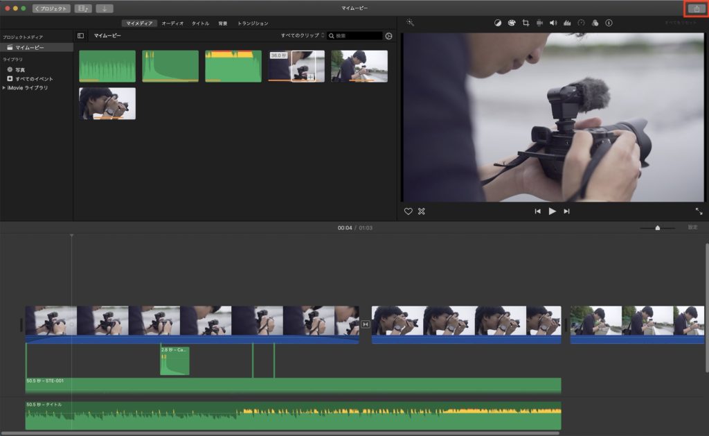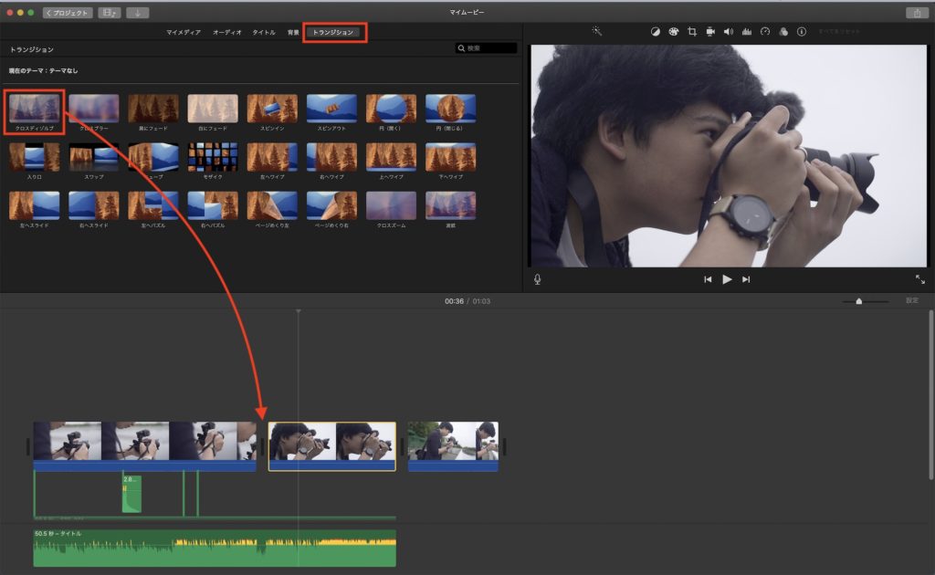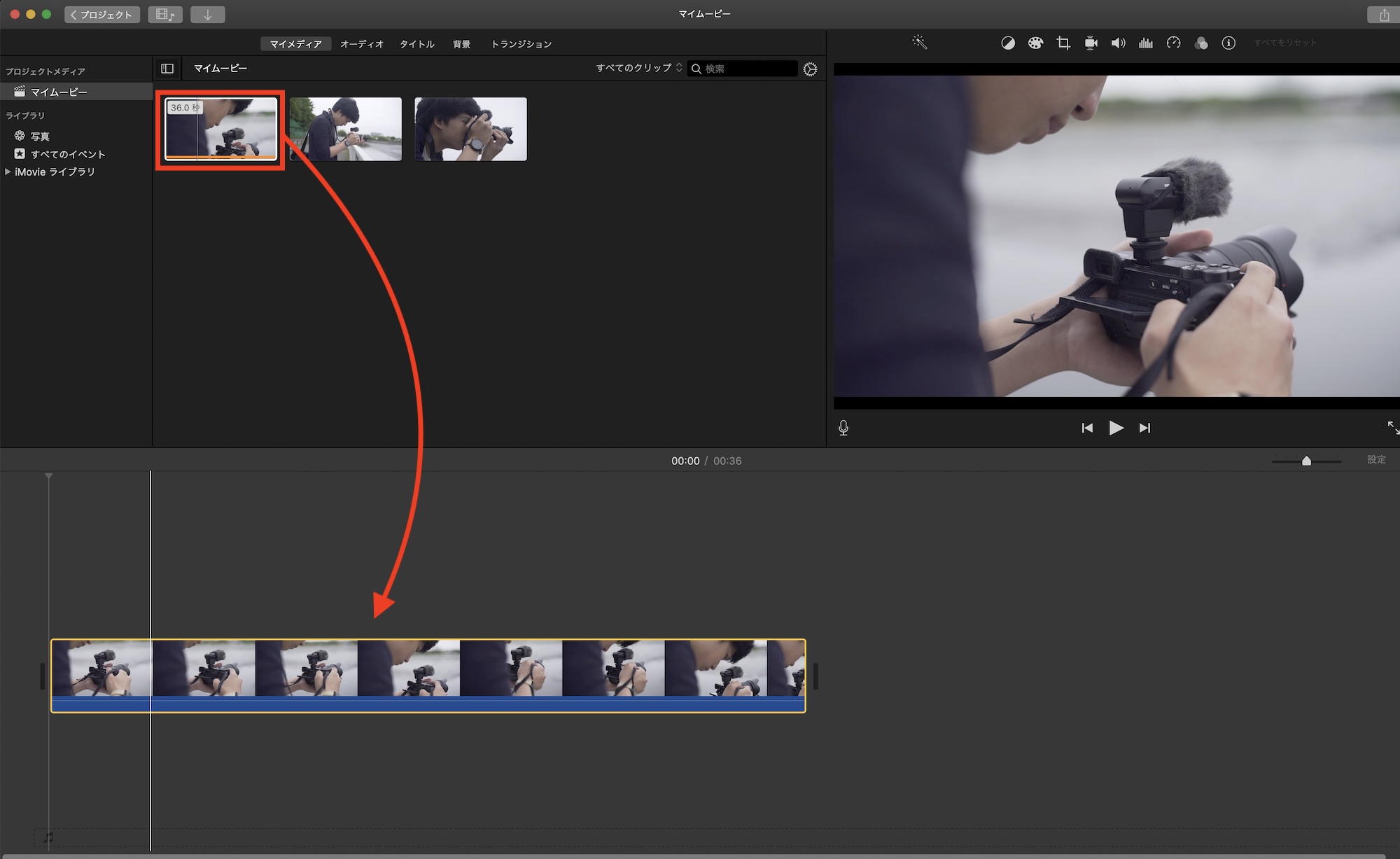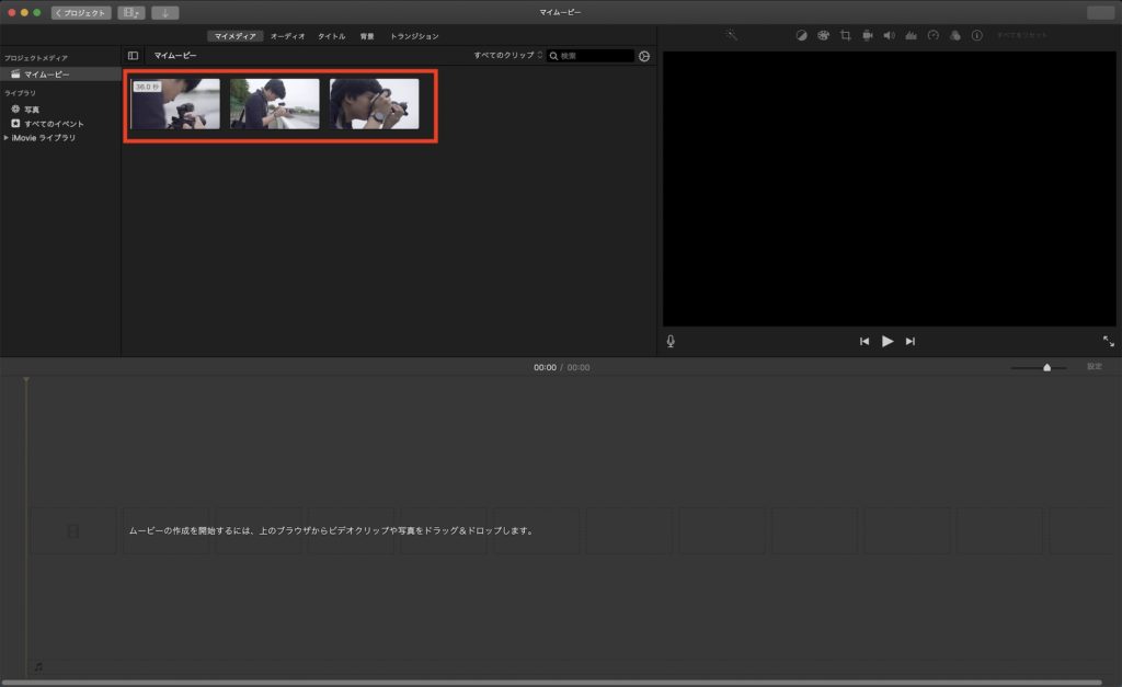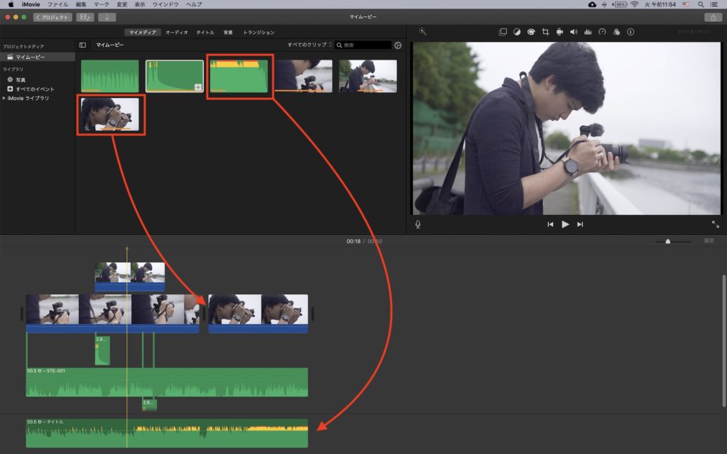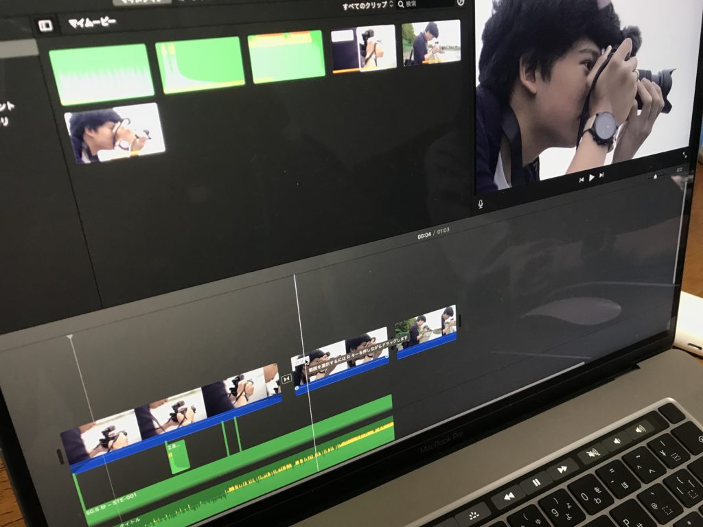 iMovieは直感的に編集が出来るようになっているため、映像やBGMなどのクリップをタイムラインにドラッグ・アンド・ドロップして作業できます。