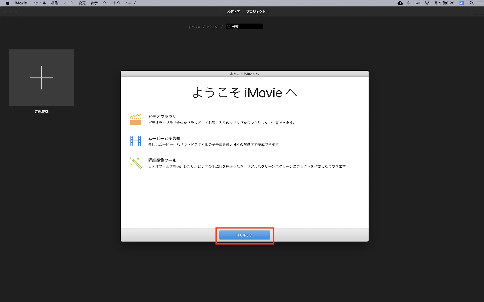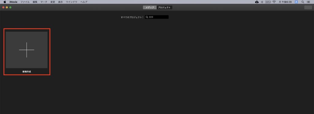 iMovieを開くとプロジェクトが一覧表示する「プロジェクトブラウザ」が表示されます。