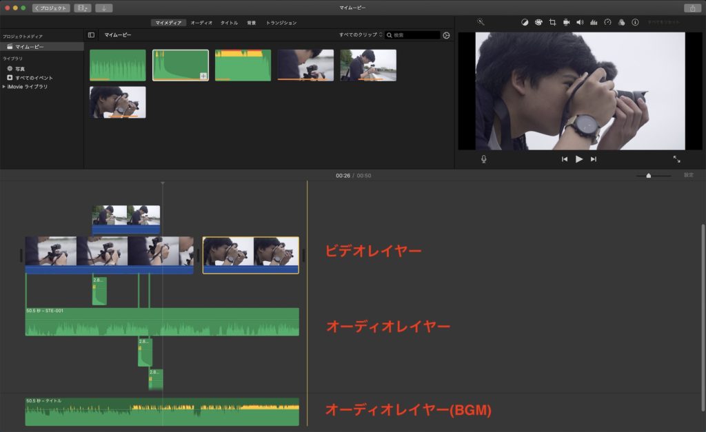 BGMや効果音など音源であればいくつものレイヤーに追加できるみたいですが、映像だと2レイヤーまで対応しているので、実写との合成を多く考えている方はiMovieだと物足りなくなるかもしれません。