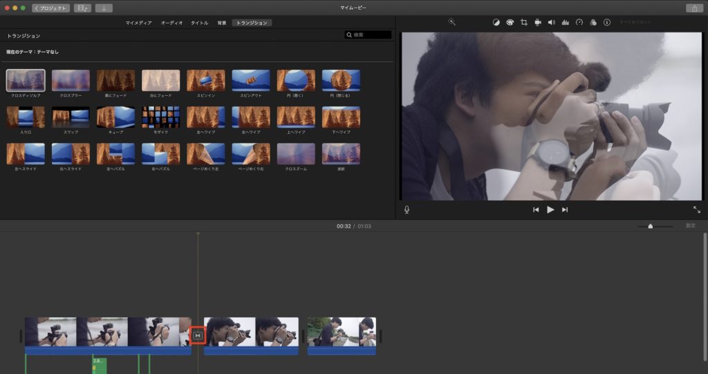 タイムラインではクリップのトリムやクリップの順番入れ替え、トランジションやタイトルの追加を行うことが出来ます。