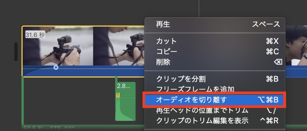 なお、ビデオとオーディオを分裂させたい場合はクリップを右クリックして「オーディオを切り離す」を選択すればオーディオレイヤーとして表示されるようになります。