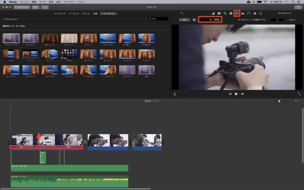 音量(ボリューム)の操作はオーディオ部分の横線またはプレビュー上部の「ボリューム」から変更すると良いでしょう。