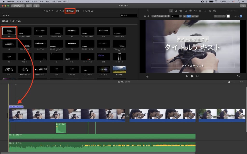 使いたいタイトルをタイムラインにドラッグ・アンド・ドロップして好きな位置に配置させましょう。